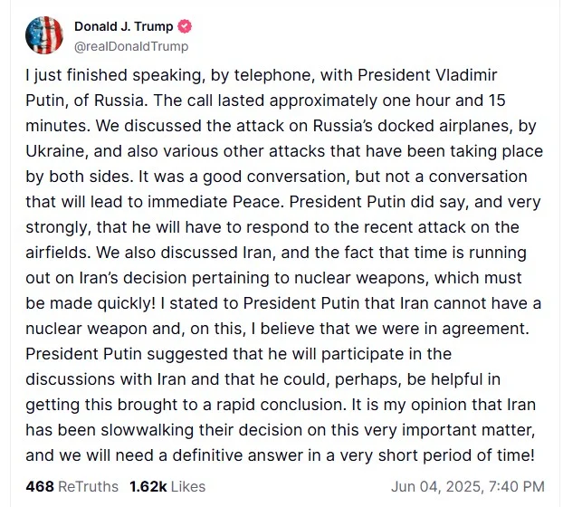 «Μόλις ολοκλήρωσα τηλεφωνική συνομιλία με τον Πρόεδρο της Ρωσίας, Βλαντιμίρ Πούτιν. Η κλήση διήρκεσε περίπου μία ώρα και 15 λεπτά. Συζητήσαμε την επίθεση της Ουκρανίας στα σταθμευμένα ρωσικά αεροσκάφη, καθώς και διάφορες άλλες επιθέσεις που πραγματοποιούνται και από τις δύο πλευρές. Ήταν μια καλή συνομιλία, αλλά όχι μια συνομιλία που θα οδηγήσει σε άμεση ειρήνη. Ο Πρόεδρος Πούτιν δήλωσε – και μάλιστα με έντονο τρόπο – ότι θα πρέπει να απαντήσει στην πρόσφατη επίθεση στα αεροδρόμια. Συζητήσαμε επίσης για το Ιράν και το γεγονός ότι ο χρόνος τελειώνει όσον αφορά την απόφαση του Ιράν σχετικά με τα πυρηνικά όπλα, μια απόφαση που πρέπει να ληφθεί άμεσα! Δήλωσα στον Πρόεδρο Πούτιν ότι το Ιράν δεν μπορεί να αποκτήσει πυρηνικό όπλο και, επ’ αυτού, πιστεύω ότι συμφωνήσαμε. Ο Πρόεδρος Πούτιν πρότεινε να συμμετάσχει στις συζητήσεις με το Ιράν και ότι ίσως θα μπορούσε να βοηθήσει ώστε να υπάρξει μια ταχεία κατάληξη. Κατά τη γνώμη μου, το Ιράν καθυστερεί σκόπιμα την απόφασή του σε αυτό το πολύ σοβαρό ζήτημα και θα χρειαστούμε μια οριστική απάντηση μέσα σε πολύ σύντομο χρονικό διάστημα!».