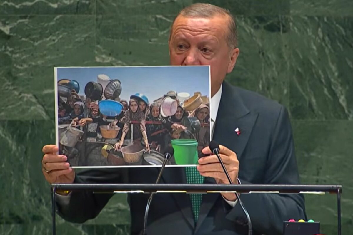 Ο Ερντογάν, χαρακτηρίζοντας τον πόλεμο στη Γάζα ως μία από τις πιο σκοτεινές στιγμές της ανθρωπότητας, έδειξε έπειτα μια άλλη φωτογραφία που απεικονίζει ένα παιδί σε προχωρημένη κατάσταση υποσιτισμού.