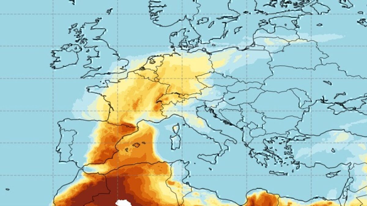 Το νέφος της σκόνης ταξιδεύει στο μεγαλύτερο μέρος της Ισπανίας για να φτάσει στη νοτιοανατολική Γαλλία, τη Γερμανία και τη νοτιοανατολική γωνία της Βρετανίας.