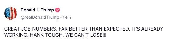 Σε νεότερη ανάρτησή του ο πρόεδρος των ΗΠΑ, εκτιμά πως τα «νούμερα είναι καλύτερα απ’ ό,τι αναμενόταν». «Δουλεύει ήδη (το σύστημα των δασμών). Κρατηθείτε δυνατά, δεν μπορούμε να χάσουμε» συμπληρώνει.