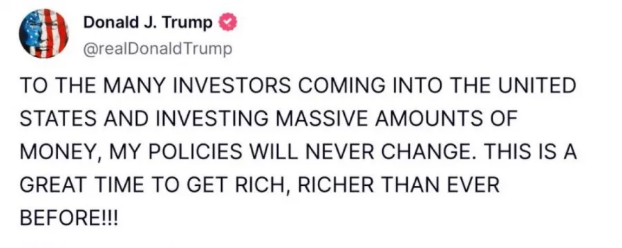 «Στους πολλούς επενδυτές που έρχονται στις Ηνωμένες Πολιτείες για να επενδύσουν τεράστια χρηματικά ποσά, η πολιτική μου δεν θα αλλάξει ποτέ. Αυτή είναι μια εξαιρετική στιγμή να γίνετε πλούσιοι, πλουσιότεροι από ποτέ», υπόσχεται ο Ντόναλντ Τραμπ με το…. καλημέρα, σε ένα μήνυμα, όλα σε κεφαλαία, που αναρτήθηκε στο δίκτυό του Truth Social.