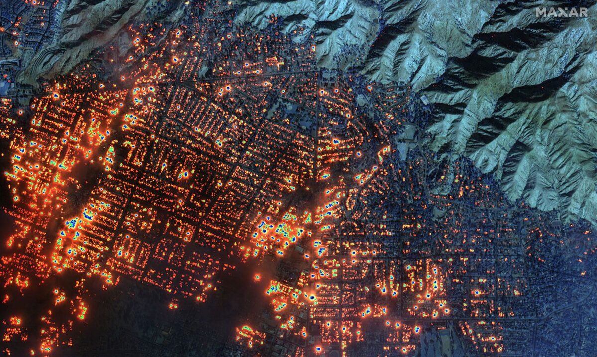 Η πυρκαγιά του Palisades, η οποία ξέσπασε την Τρίτη και είχε κατακάψει πάνω από 1.000 σπίτια, επιχειρήσεις και άλλες κατασκευές μέχρι το απόγευμα της Τετάρτης, άφησε ελάχιστα σπίτια ανέπαφα στην περιοχή αυτή. Η δορυφορική υπέρυθρη εικόνα δείχνει δεκάδες κατασκευές να φλέγονται και πολλές άλλες ολοκληρωτικά κατεστραμμένες την Τετάρτη.