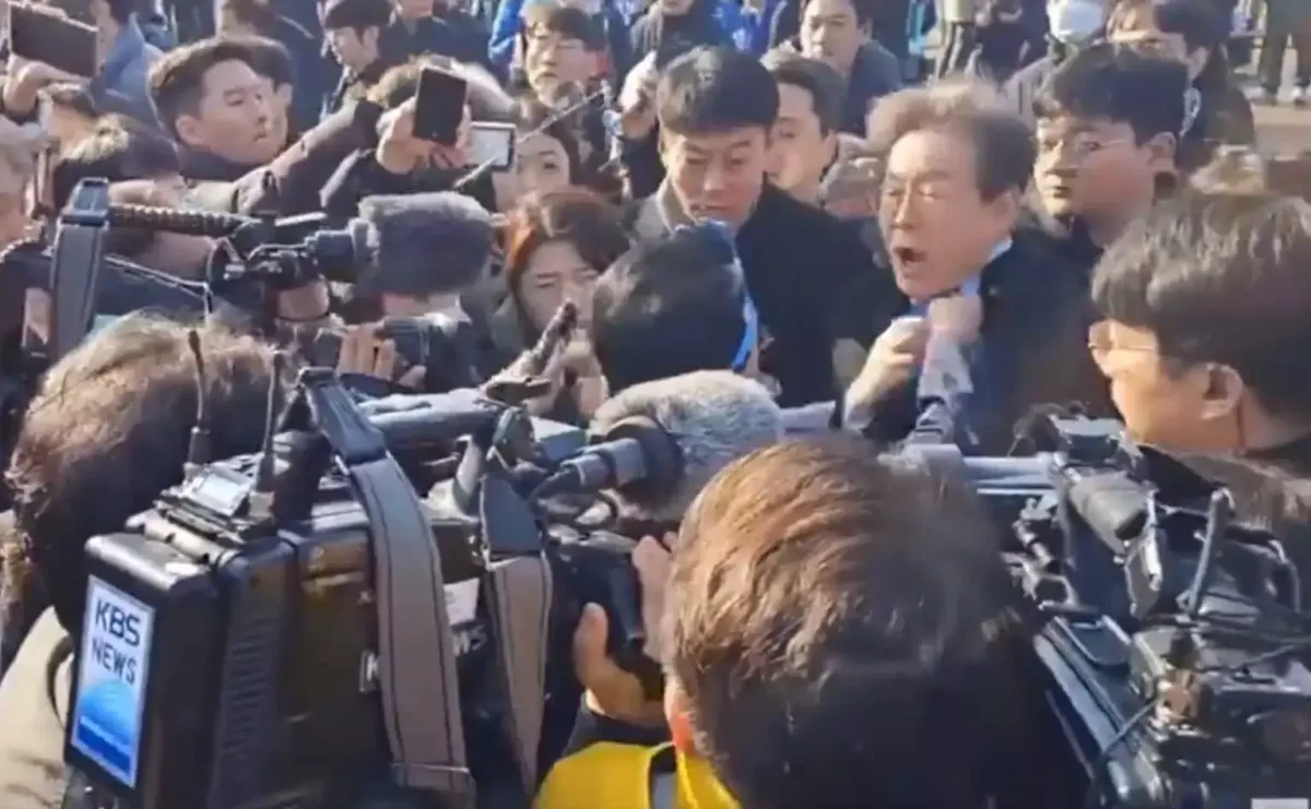 Ο Λι, πρόεδρος του Δημοκρατικού Κόμματος της Κορέας της αξιωματικής αντιπολίτευσης, δέχθηκε επίθεση στην αριστερή πλευρά του λαιμού του από έναν άγνωστο άνδρα στις 10:27 π.μ. κατά τη διάρκεια μίας συνέντευξης Τύπου μετά από περιήγηση στο εργοτάξιο ενός νέου αεροδρομίου στο Gadeok.