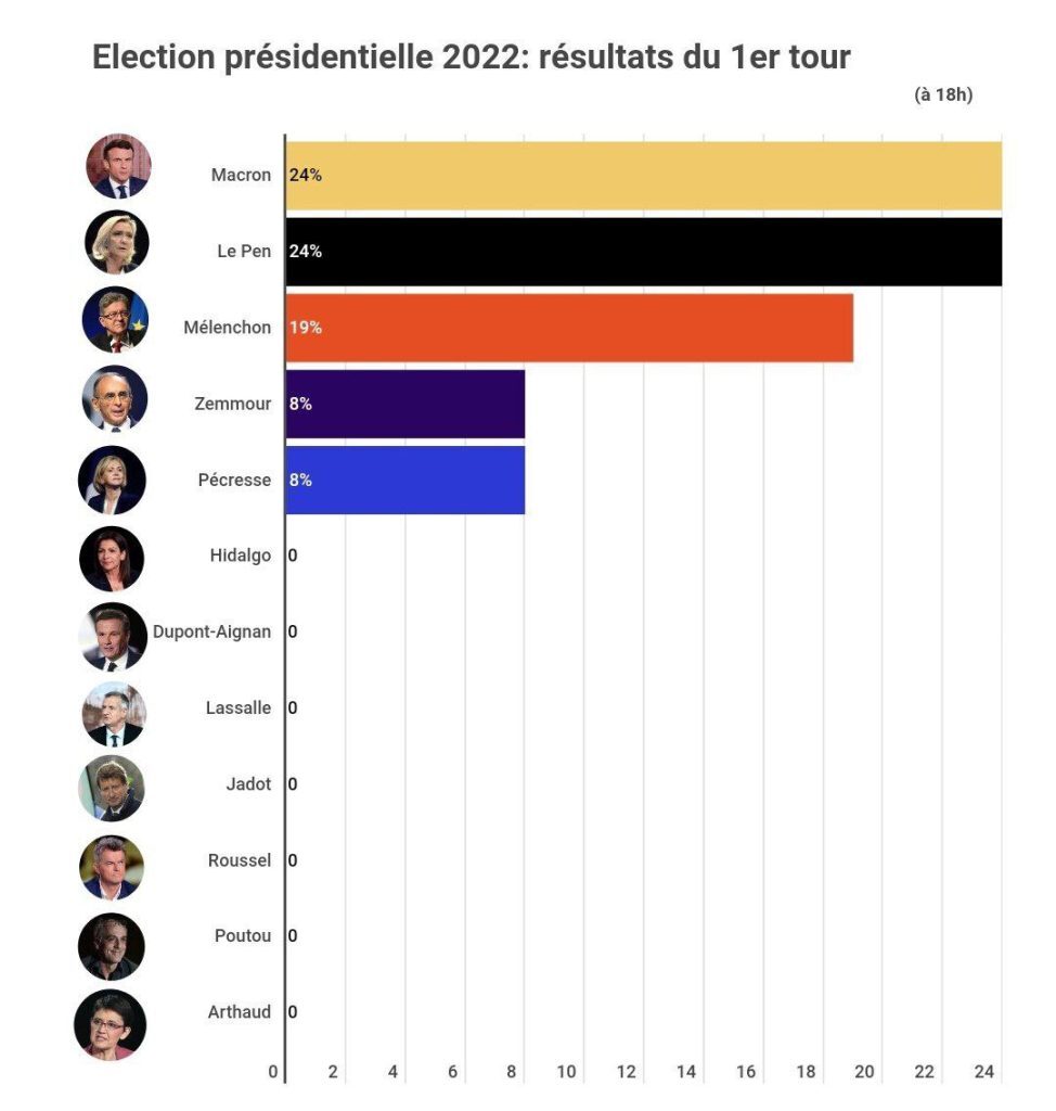 Ειδικότερα, ο νυν Πρόεδρος και η Μαριν Λεπέν συγκεντρώνουν από 24%. Τρίτος έρχεται ο αριστερός Ζαν Λυκ Μελανσόν με 19% και τέταρτος με 8% ο επίσης ακροδεξιός Ερίκ Ζεμούρ.