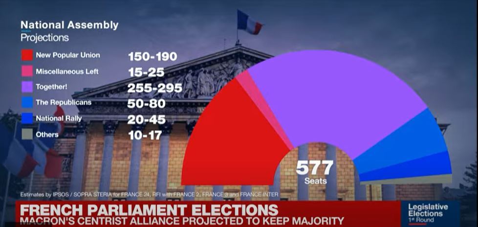 Στην τρίτη θέση έρχεται το ακροδεξιό κόμμα της Μαρίν Λεπέν με 18,9%, ενώ την τέταρτη θέση φέρεται να καταλαμβάνουν οι Ρεπουμπλικανοί με 13,7%. Σύμφωνα με τον ίδιο τηλεοπτικό δίκτυο, σε έδρες η παράταξη Μακρόν εμφανίζεται πρώτη, χωρίς ωστόσο να είναι βέβαιο πως θα έχει την πλειοψηφία.