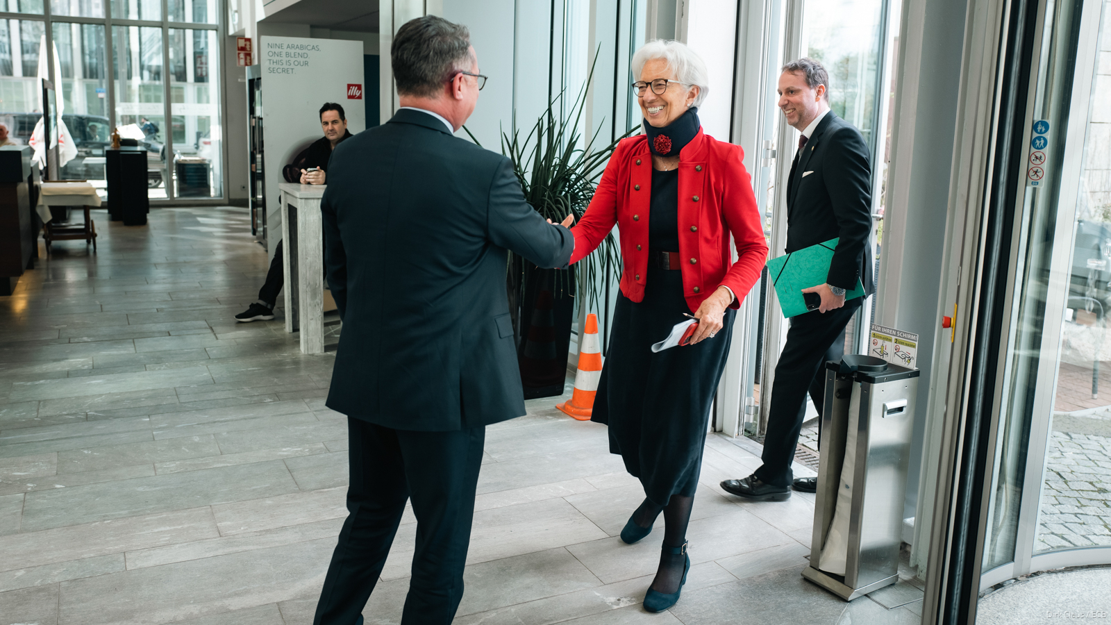 Η κυρία Λαγκάρντ, όπως φαίνεται στις φωτογραφίες που ανήρτησε στο Twitter από την παρουσία της σε εκδήλωση της Τράπεζας Διεθνών Διακανονισμών για ένα κέντρο αφιερωμένο στην τεχνολογική καινοτομία στον χρηματοπιστωτικό τομέα, φρόντισε να στολίσει το κολάρο με ένα λουλούδι.