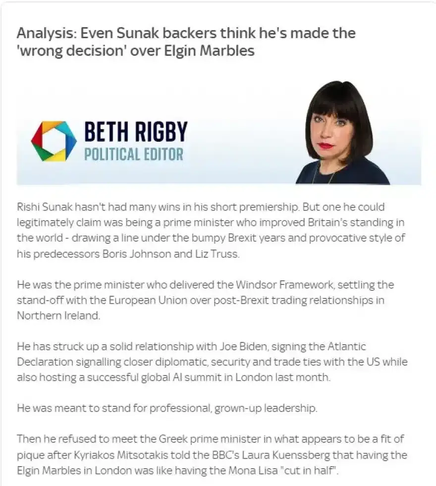 Ακόμα και οι υποστηρικτές του Ρίσι Σούνακ φοβούνται ότι πήρε τη λάθος απόφαση «ξεκινώντας καβγά» με τον Έλληνα πρωθυπουργό για τα Γλυπτά του Παρθενώνα, αναφέρει σε άρθρο της στο Sky News η πολιτική συντάκτρια Μπεθ Ρίγκμπι.