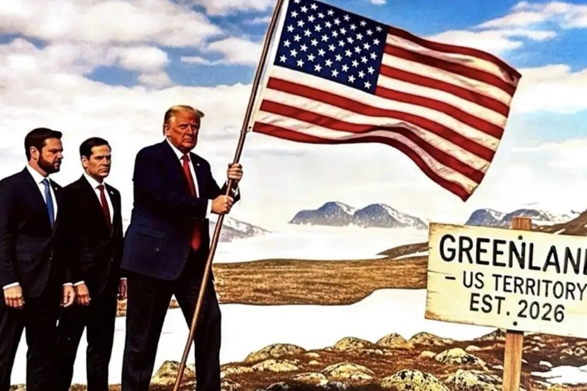 Συγκεκριμένα, στην πρώτη AI φωτογραφία φαίνεται ο Τραμπ, ενώ από πίσω του ακολουθούν οι Τζέι Ντι Βανς και Μάρκο Ρούμπιο, να τοποθετεί μία αμερικανική σημαία και μία πινακίδα να γράφει: «Γροιλανδία: Έδαφος των ΗΠΑ από το 2026».