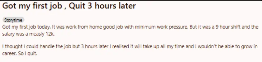 Στην ανάρτησή τους με τίτλο «Βρήκα την πρώτη μου δουλειά, παραιτήθηκα 3 ώρες αργότερα», ο χρήστης περιέγραψε τον ρόλο του ως εργασία από το σπίτι με μεγάλη βάρδια εννέα ωρών και μισθό 12.000 ρουπιών. Ενώ η εργασία χαρακτηρίστηκε ως χαμηλής πίεσης, ο χρήστης γρήγορα συνειδητοποίησε ότι οι απαιτήσεις θα κατανάλωναν πολύ από τον χρόνο του, εμποδίζοντας τελικά την επαγγελματική του εξέλιξη. Δήλωσε: «Νόμιζα ότι θα μπορούσα να τα καταφέρω με τη δουλειά, αλλά τρεις ώρες αργότερα συνειδητοποίησα ότι θα μου έπαιρνε όλο τον χρόνο και δεν θα μπορούσα να εξελιχθώ στην καριέρα μου. Έτσι παραιτήθηκα».