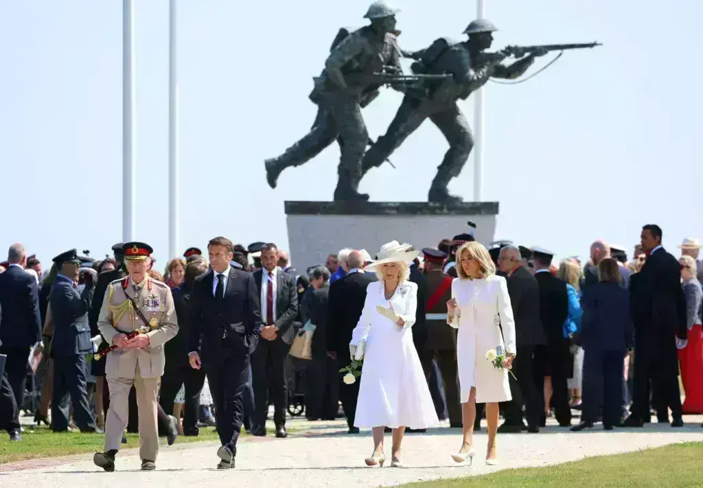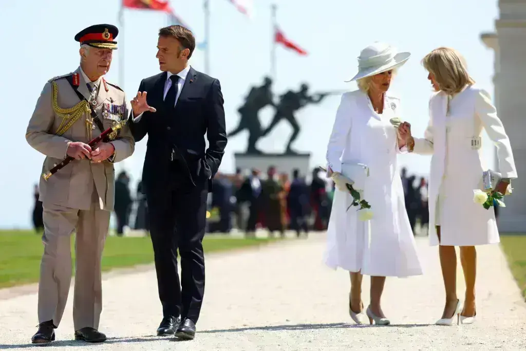 Εμανουέλ και Μπριζίτ Μακρόν υποδέχτηκαν το βασιλικό ζεύγος, το μεσημέρι της Πέμπτης, με τις δύο κυρίες να εμφανίζονται ντυμένες στα λευκά για να καταθέσουν στεφάνια στο Μνημείο της Βρετανικής Νορμανδίας στο Ver-sur-Mer.