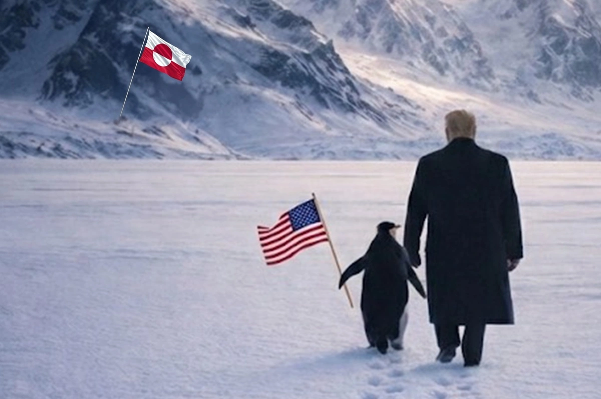 Για όσους γνωρίζουν, αυτό είναι μια παραλλαγή του meme «nihilist penguin», το οποίο έγινε viral στο TikTok τις τελευταίες εβδομάδες. Βασίζεται σε μια σκηνή από το ντοκιμαντέρ του Werner Herzog του 2007 Encounters at the End of the World, στο οποίο ένας πιγκουίνος χωρίζεται ανεξήγητα από την αποικία και περιπλανιέται προς το εσωτερικό της Ανταρκτικής, προς βέβαιο θάνατο. «Αλλά γιατί;» αναρωτιέται ο Herzog. Πολλοί έχουν θέσει το ίδιο ερώτημα για τις ουτοπικές προσπάθειες του Τραμπ να αποκτήσει τη Γροιλανδία.