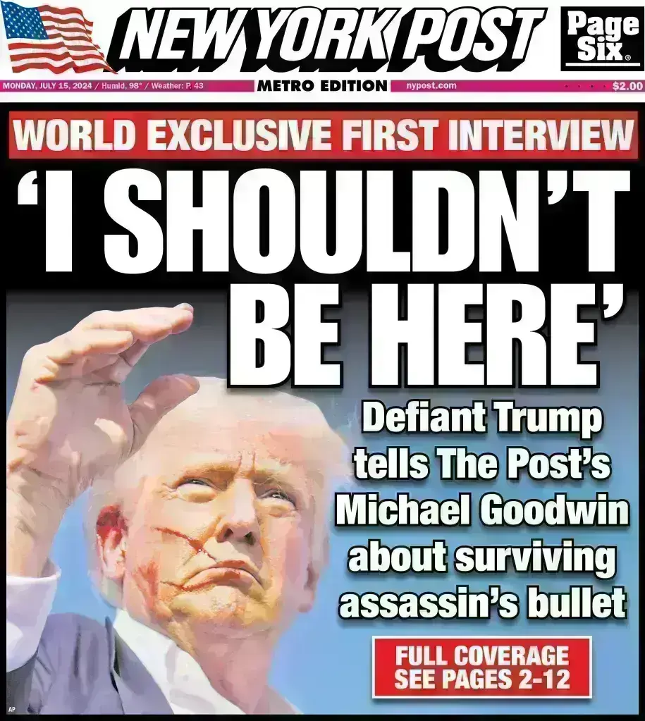 «Δεν θα έπρεπε να είμαι εδώ, θα έπρεπε να είμαι νεκρός», δήλωσε ο Τραμπ στην εφημερίδα από το αεροσκάφος που τον μετέφερε στο Μιλγουόκι για να παραστεί στο εθνικό συνέδριο των Ρεπουμπλικανών, όπου αναμένεται να λάβει και επισήμως το χρίσμα του κόμματος για να είναι υποψήφιος στις προεδρικές εκλογές του Νοεμβρίου.