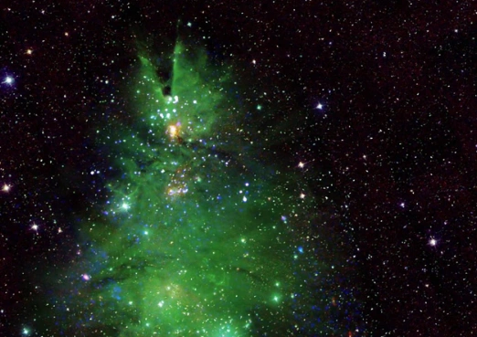 Αυτά τα αστέρια φαίνονται στη φωτογραφία ως μπλε και άσπρα φώτα, και περιβάλλονται από στροβιλισμούς αερίου – τις «πευκοβελόνες» του δέντρου – ενώ το πράσινο αντιπροσωπεύει το φως στο ορατό φάσμα.