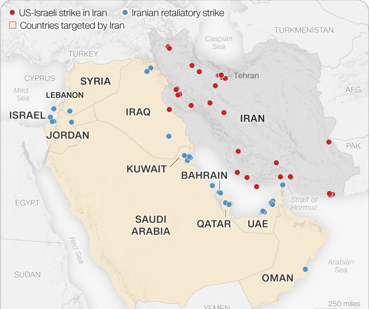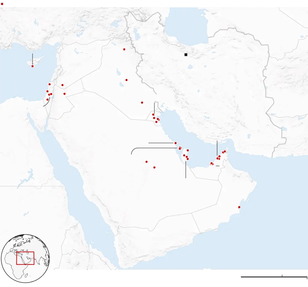 Το Ιράν έπληξε στόχους, μεταξύ των οποίων πολυτελή ξενοδοχεία στο Ντουμπάι και το Μπαχρέιν, καθώς και αεροδρόμια στο Ντουμπάι, το Κουβέιτ και το Μπαχρέιν. Καπνός εθεάθη να υψώνεται πάνω από το νησί Palm Jumeirah στο Ντουμπάι τη Δευτέρα, ενώ φωτογραφίες έδειξαν ζημιές σε κτίρια στο Μπαχρέιν.