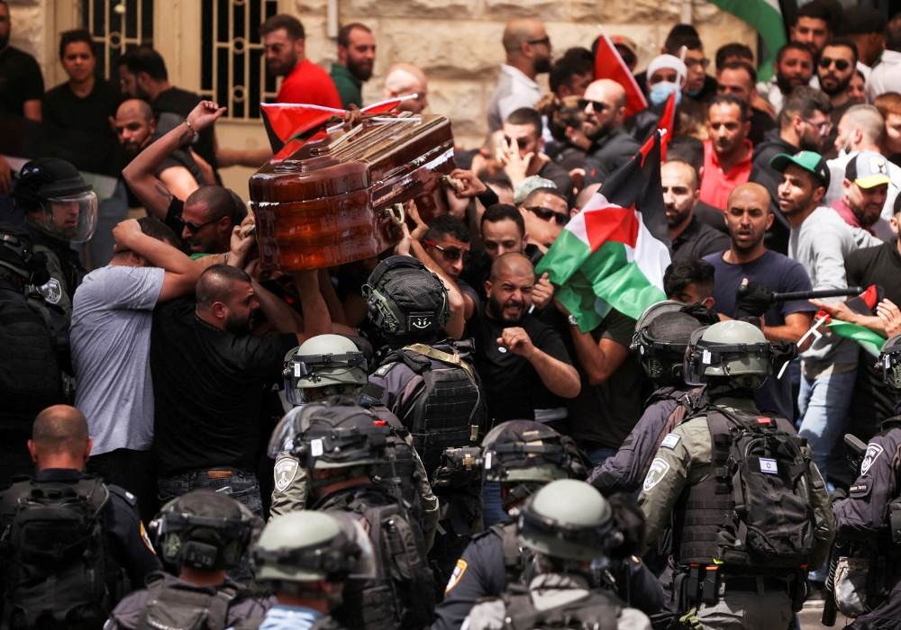 Πλάνα που μετέδωσε το δίκτυο Palestine TV δείχνουν το φέρετρο της δημοσιογράφου του Αλ Τζαζίρα, που σκοτώθηκε προχθές Τετάρτη στη διάρκεια μιας ισραηλινής επιδρομής στη Δυτική Όχθη, να κινδυνεύει να πέσει στο έδαφος ενώ Ισραηλινοί αστυνομικοί διαλύουν το πλήθος.