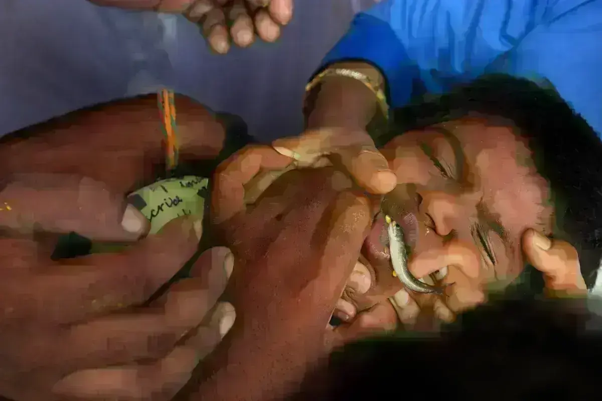 Αφού μαζέψει το ζωντανό ψάρι σε μια πλαστική σακούλα γεμάτη νερό, το κάθε άτομο το δίνει σε έναν συνοδό που συνεργάζεται με την οικογένεια Μπαθίνη, ο οποίος σφίγγει μια κίτρινη φυτική πάστα στο στόμα του ψαριού και τον βοηθά να το καταπιεί.