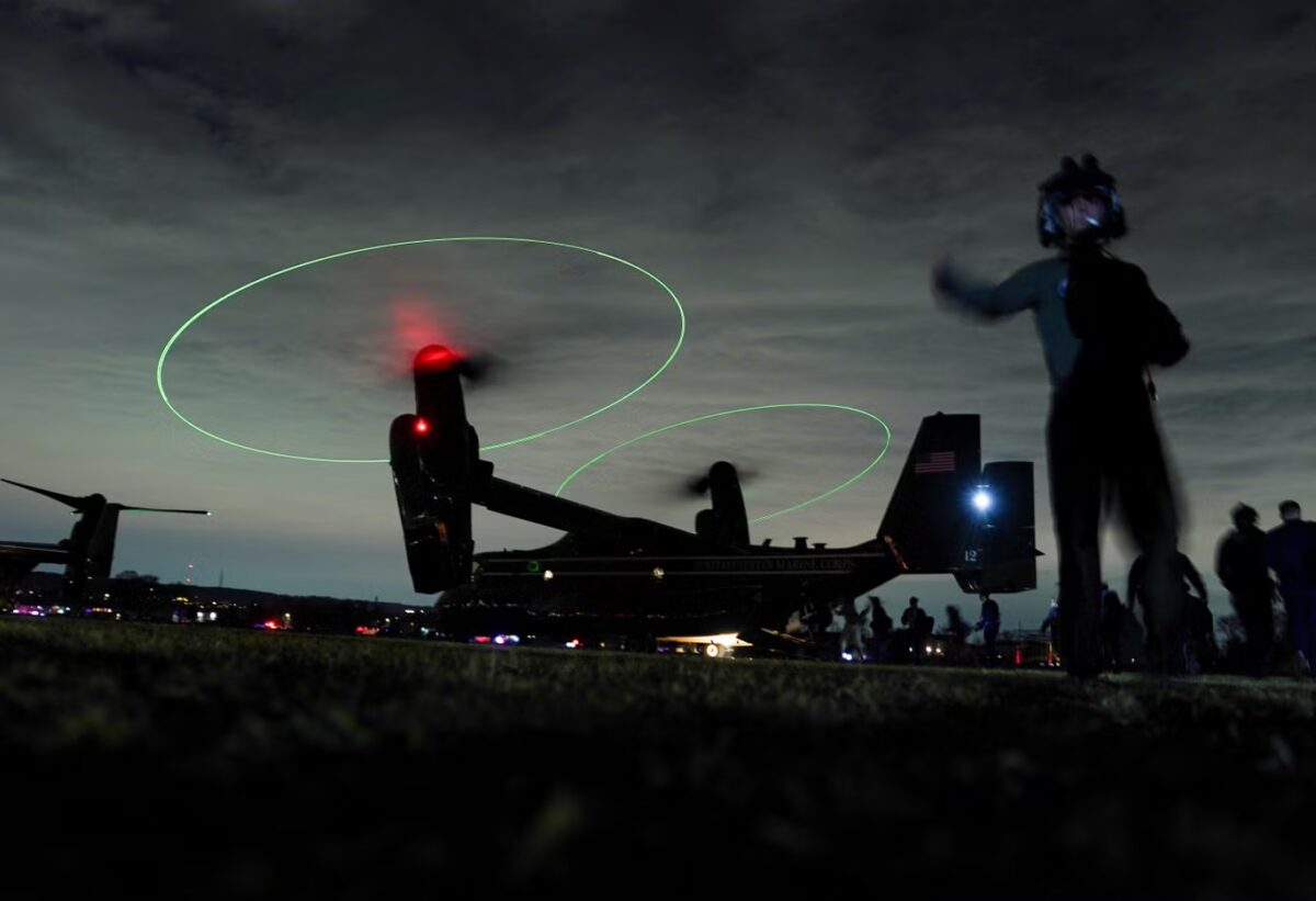 Ένας δημοσιογράφος που ταξίδευε με τον πρόεδρο ανέφερε ότι είδε μια φωτιά κάτω από τη δεξιά μηχανή λίγο πριν ειδοποιηθεί το προσωπικό ότι το Osprey – μέρος του στόλου των προεδρικών ελικοπτέρων του Σώματος Πεζοναυτών HMX-1 – θα καθηλωθεί.