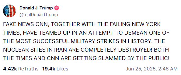 Ο πρόεδρος Τραμπ, μετά την επιχείρηση, δήλωσε πως οι πυρηνικές εγκαταστάσεις του Ιράν «καταστράφηκαν ολοσχερώς». Ωστόσο, σύμφωνα με την αξιολόγηση της DIA, η υποδομή εμπλουτισμού στο Fordo, που βρίσκεται σε μεγάλο βάθος κάτω από το βουνό, παραμένει σε μεγάλο βαθμό ανέπαφη.