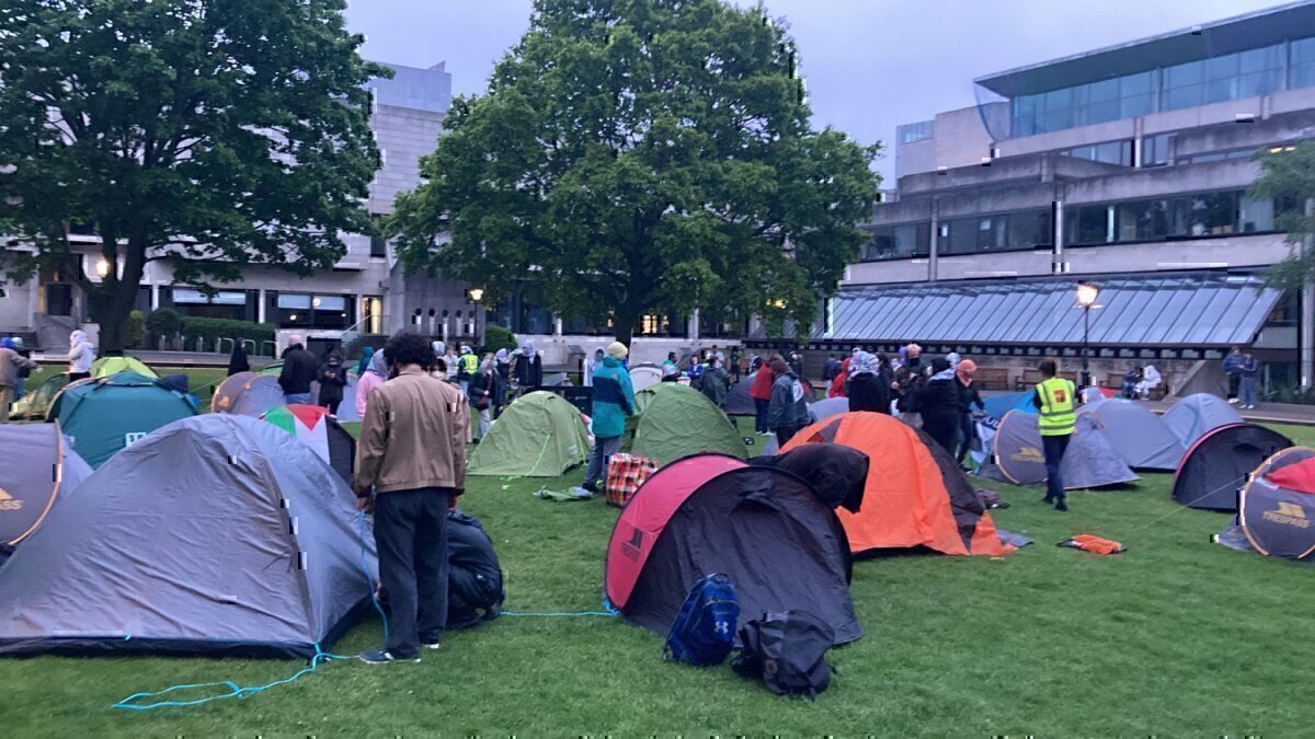 Ο καταυλισμός στήθηκε αργά το βράδυ της Παρασκευής, αφού η ένωση των φοιτητών ανέφερε ότι της επιβλήθηκε πρόστιμο 214.000 ευρώ από το πανεπιστήμιο για τις οικονομικές απώλειες που υπέστη λόγω των κινητοποιήσεων που έγιναν τους τελευταίους μήνες και δεν αφορούσαν αποκλειστικά τον πόλεμο στη Γάζα. Ο πρόεδρος της ένωσης Λάζλο Μολνάρφια ανάρτησε μια φωτογραφία που δείχνει πάγκους στοιβαγμένους μπροστά στην είσοδο του κτιρίου όπου εκτίθεται το Βιβλίο του Κελς. Τα χειρόγραφα αυτά χρονολογούνται από το 800 μ.Χ. και είναι έργο Κελτών μοναχών.