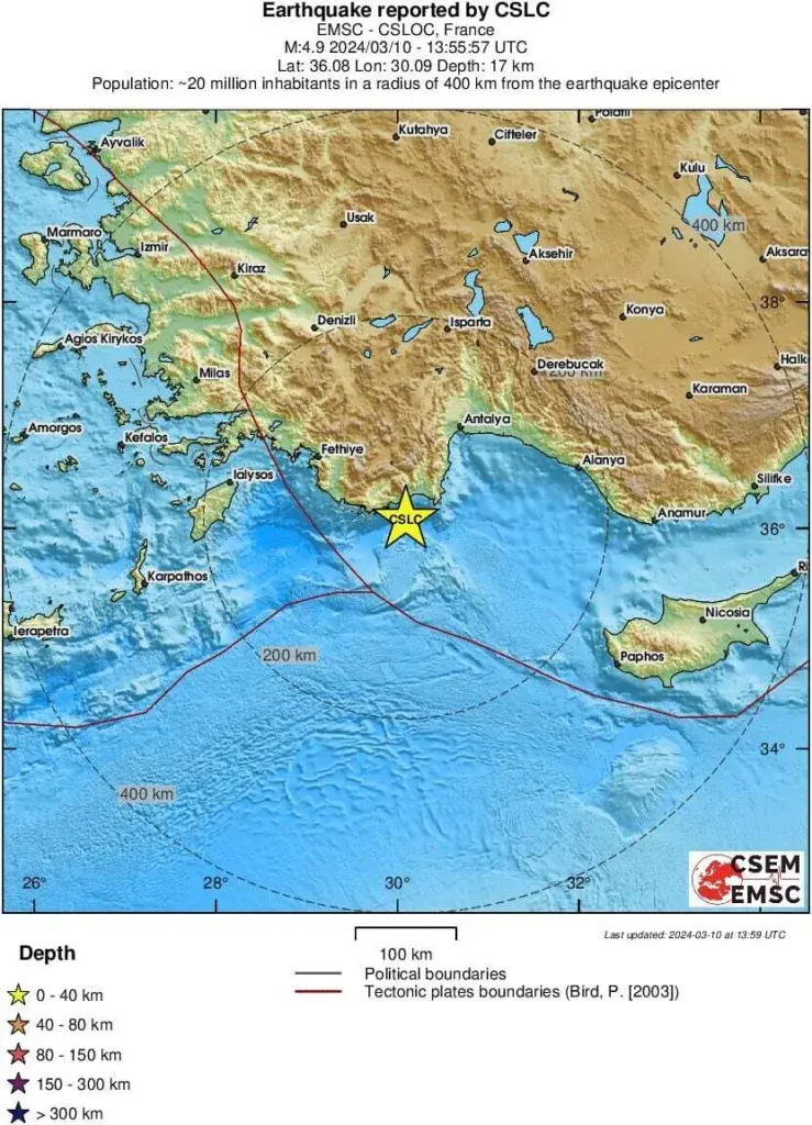 Σύμφωνα με το Ευρωμεσογειακό Ινστιτούτο, το επίκεντρο του σεισμού εντοπίζεται 110 χιλιόμετρα νοτιοδυτικά της Αττάλειας και 22 χιλιόμετρα νοτιοανατολικά του Ντέμρε ενώ το εστιακό βάθος υπολογίζεται στα 21 χιλιόμετρα. Το σημείο που έγινε ο σεισμός βρίσκεται περίπου 50 χιλιόμετρα ανατολικά του Καστελόριζου.