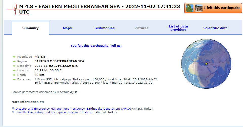 Ο σεισμός, ο οποίος σημειώθηκε στα ανοιχτά της Αττάλειας είχε βάθος 10 χλμ. και είχε ένταση 4,8 Ρίχτερ σύμφωνα με το Ευρωπαϊκό Μεσογειακό Σεισμολογικό Κέντρο.