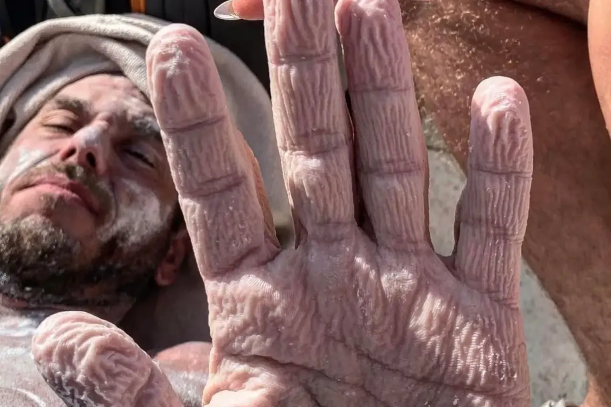 Παράλληλα με το μήνυμα, ο Edgley μοιράστηκε μερικά στιγμιότυπα με την κατάσταση στην οποία περιήλθε το δέρμα του λόγω του χρόνου που πέρασε στο νερό.