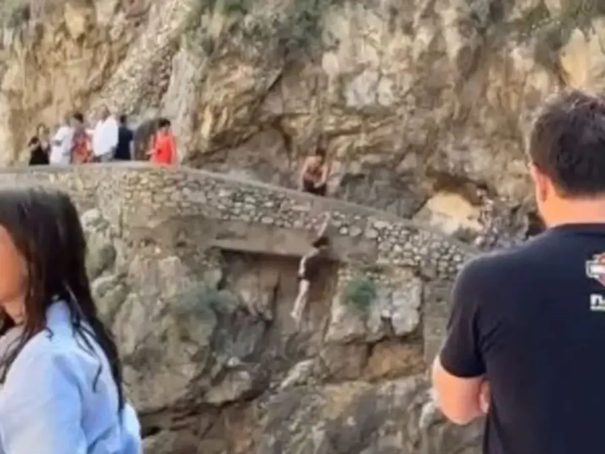 Η γυναίκα, η οποία στεκόταν στην κορυφή ενός βράχου στο Fiordo di Furore στην Ιταλία, φαινόταν να σκέφτεται αν θα κάνει το ριψοκίνδυνο άλμα όταν έχασε την ισορροπία της.