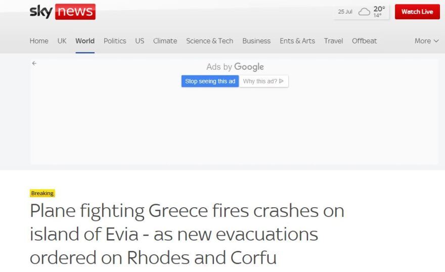 Στο τρομακτικό περιστατικό αναφέρεται και το βρετανικό δίκτυο Skynews που γράφει ότι το αεροσκάφος έπεσε σε ρεματιά στην Κάρυστο ενόσω το έργο κατάσβεσης των πυροσβεστών προχωρά.