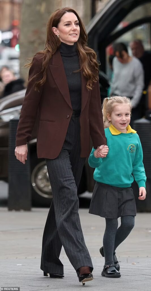 Η Kate φορούσε ένα καφέ σακάκι πάνω από ένα μαύρο μάλλινο πουλόβερ με ψηλό γιακά και παντελόνι με ρίγες.
