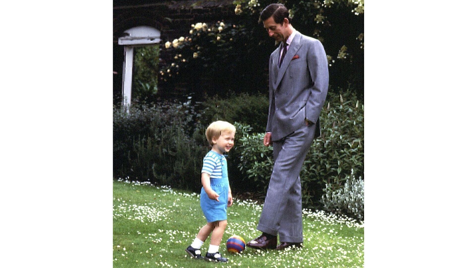 Στη φωτογραφία, ο νεαρός πρίγκιπας χαμογελά καθώς αυτός και ο μελλοντικός μονάρχης στέκονται σε έναν κήπο.