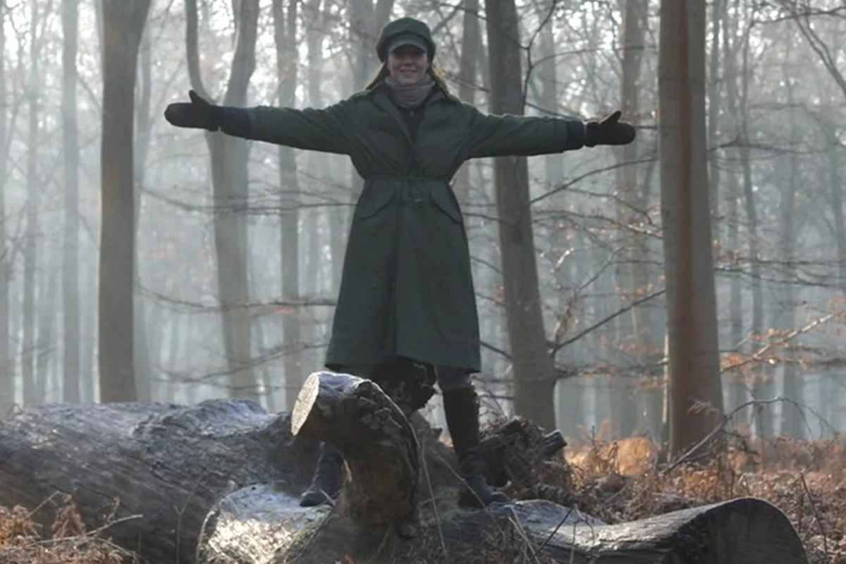 Η φωτογραφία της Πριγκίπισσας Κέιτ τραβήχτηκε στη φύση και την δείχνει να στέκεται πάνω σε έναν μεγάλο κορμό δέντρου στο δάσος με τα χέρια απλωμένα και στις δύο πλευρές. Η Κέιτ χαμογελάει πλατιά, με τον ήλιο να δύει πίσω από τα δέντρα, ντυμένη με ένα σκούρο πράσινο παλτό, γκρι παντελόνι, έναν ταιριαστό κασκόλ, μαύρες μπότες ιππασίας, μαύρα πλεκτά γάντια και σκούρο πράσινο καπέλο. Τα μαλλιά της είναι κάτω και φυσικά και φαίνεται να φοράει ελάχιστο μακιγιάζ.