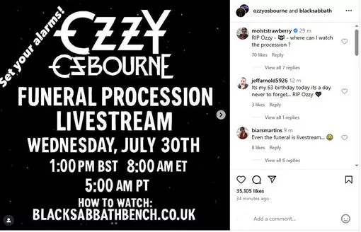 Η επίσημη σελίδα του στο Instagram, η οποία πλέον έχει μια φωτογραφία προφίλ με ένα μόνο μαύρο κερί, ενημέρωσε τους θαυμαστές για τη ζωντανή μετάδοση, η οποία θα ξεκινήσει στις 1 μ.μ. Μπορείτε να την παρακολουθήσετε στο blacksabbathbench.co.uk .