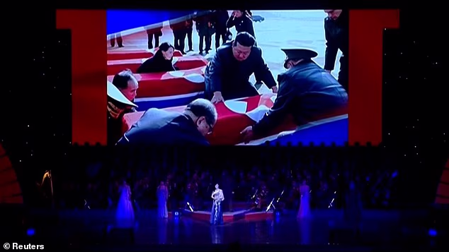 Οι εικόνες, που μεταδόθηκαν από την Κεντρική Τηλεόραση της Κορέας (KCTV), έδειχναν τον Κιμ να τοποθετεί με σοβαρότητα τη σημαία της Βόρειας Κορέας πάνω σε φέρετρο κατά τη διάρκεια τελετής για την επιστροφή των λειψάνων στρατιωτών που είχαν αναπτυχθεί και σκοτωθεί στον πόλεμο της Μόσχας κατά του Κιέβου.