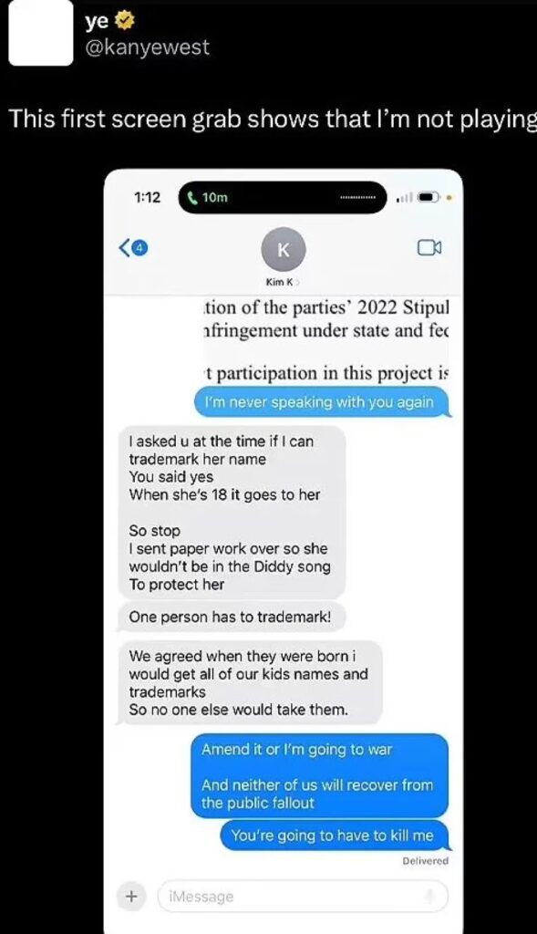 Η Καρντάσιαν φέρεται να συνεχίζει λέγοντας: «Ένα άτομο πρέπει να έχει το εμπορικό σήμα. Συμφωνήσαμε όταν γεννήθηκαν τα παιδιά ότι θα έπαιρνα όλα τα ονόματά τους και τα εμπορικά σήματα, ώστε να μην τα εκμεταλλευτεί κανείς άλλος». Ο Γουέστ φέρεται να απαντά απειλητικά: «Τροποποίησέ το ή θα πάμε σε πόλεμο, και κανείς από τους δυο μας δεν θα επιβιώσει από τη δημόσια κατακραυγή», κλιμακώνοντας με τη φράση: «Θα πρέπει να με σκοτώσεις».
