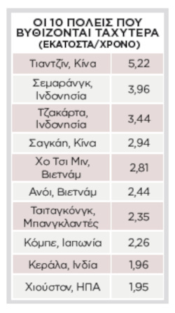 Την ίδια ώρα νέα έρευνα (Geophysical Research Letters) σε 99 περιοχές αποκαλύπτει πως μεγάλες παραθαλάσσιες πόλεις, όπως το Μαϊάμι και η Γκουνγκτζού, βυθίζονται με ταχύτερο ρυθμό από την άνοδο της στάθμης της θάλασσας. Το Παγκόσμιο Οικονομικό Φόρουμ που δημοσίευσε την έρευνα καταλήγει ότι 33 πόλεις στον κόσμο βυθίζονται κατά ένα εκατοστό κάθε χρόνο, πενταπλάσιο από το ρυθμό ανόδου της στάθμης της θάλασσας, με βάση πρόσφατες εκτιμήσεις για την παγκόσμια άνοδο της στάθμης της θάλασσας. Οι πόλεις κυρίως στη Νότια και Νοτιοανατολική Ασία αναγκάζονται να προσαρμοστούν στα νέα δεδομένα. Ενδεικτικό παράδειγμα η Ινδονησία, που μεταφέρει την πρωτεύουσά της από την Τζακάρτα, μια μεγαλούπολη 10,5 εκατομμυρίων κατοίκων, σε μια νεόκτιστη πόλη στο νησί Βόρνεο, εν μέρει επειδή η Τζακάρτα βυθίζεται.