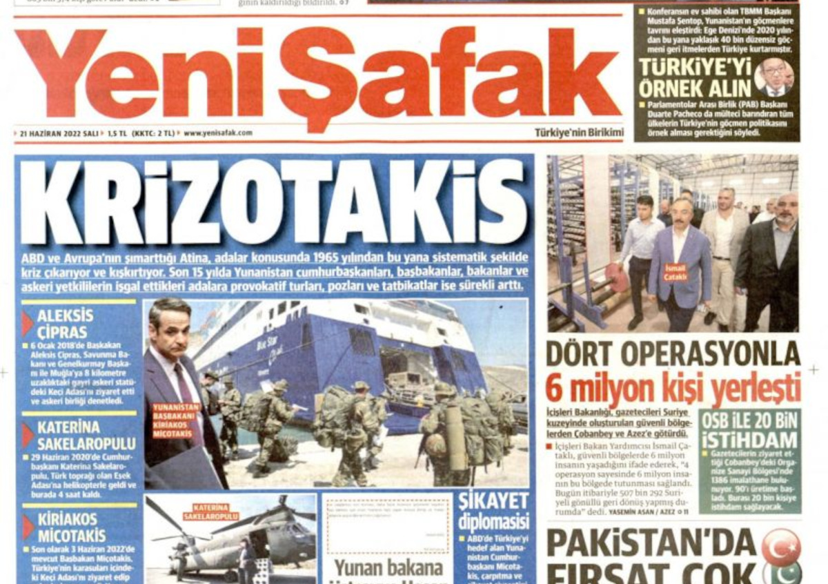 Σε πρωτοσέλιδό της η Yeni Safak, φιλοξενεί άρθρο με τίτλο «Krizotakis» κατηγορώντας τον Κυριάκο Μητσοτάκη ότι προκαλεί κρίσεις στις σχέσεις Ελλάδας- Τουρκίας.