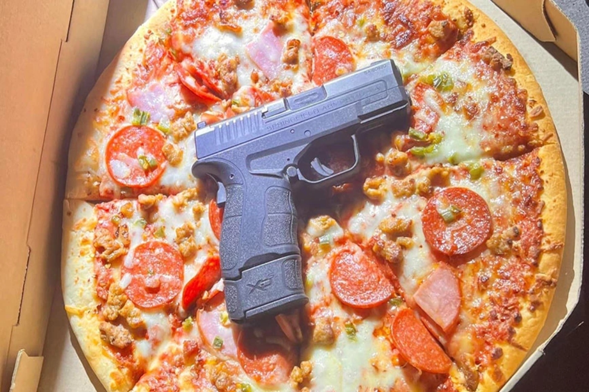 Τότε, οι αστυνομικοί σταμάτησαν το αμάξι του 47χρονου Danny Carson, που βρίσκεται σε κοινοτική επίβλεψη, επειδή έχει παραβιάσει νομοθεσίες που αφορούν την οπλοκατοχή. «Οι αστυνομικοί εντόπισαν ένα πριονισμένο κυνηγετικό όπλο και δύο γεμάτα πιστόλια, το ένα από τα οποία ήταν κρυμμένο σε ένα κουτί πίτσας πάνω από την πίτσα», ανέφερε το γραφείο του σερίφη.