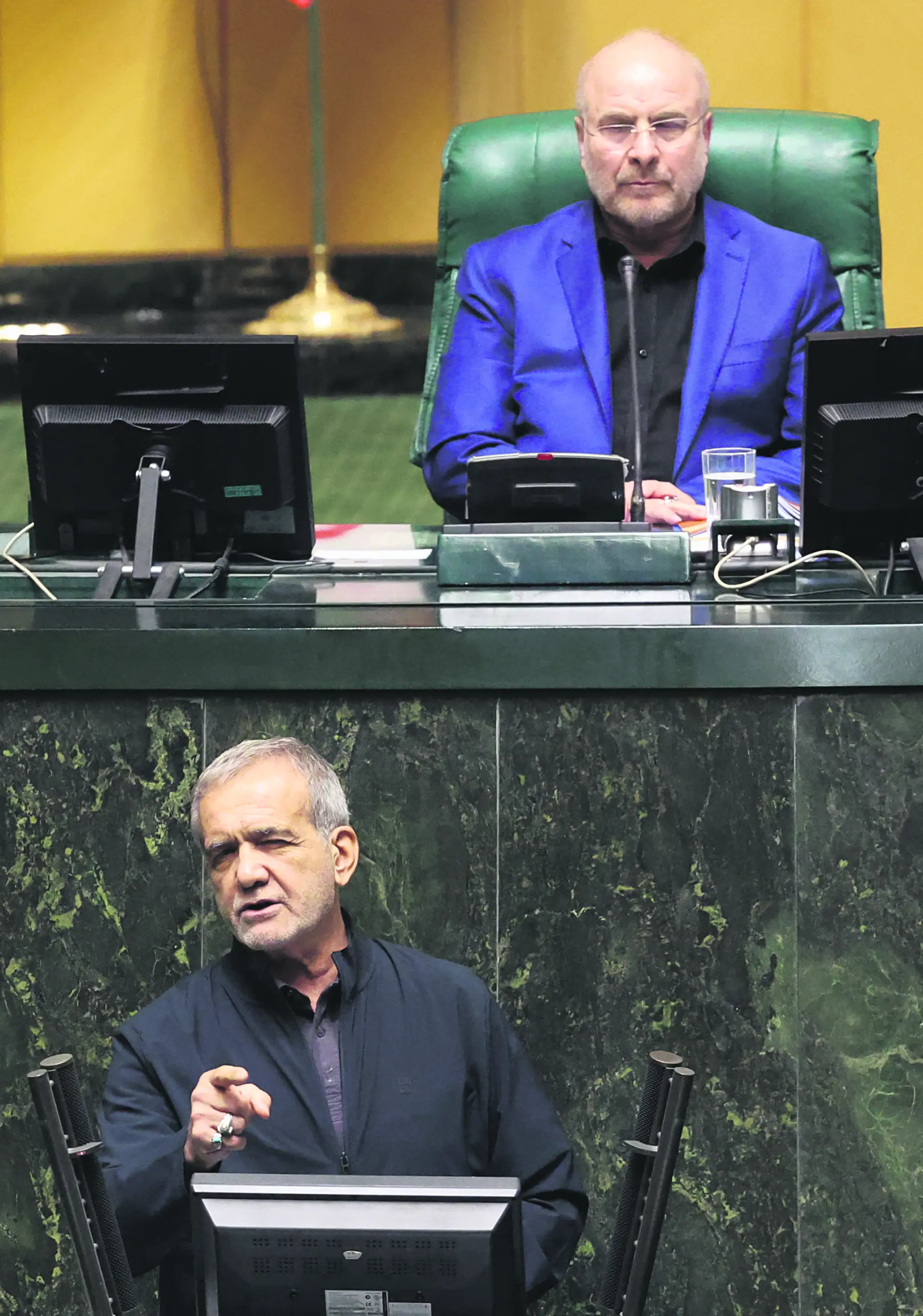 Ο ρόλος των σκληροπυρηνικών στο Ιράν σηματοδοτεί τη χαμηλή πολιτική επιρροή του εκλεγμένου προέδρου, Μασούντ Πεζεσκιάν, ενός μεταρρυθμιστή, ο οποίος υπερτερεί του Μοχάμεντ Μπαγκέρ Γκαλιμπάφ στην επίσημη δομή εξουσίας. Ο Πεζεσκιάν είναι το δημόσιο πρόσωπο της κυβέρνησης την Τεχεράνη από την έναρξη του πολέμου, αλλά ο ρόλος του περιορίζεται σε μεγάλο βαθμό στην προσπάθεια μετριασμού των επιπτώσεων των βομβαρδισμών των ΗΠΑ και του Ισραήλ στον άμαχο πληθυσμό. Θεωρείται ότι αντιτίθεται στη σκληροπυρηνική στρατηγική, πιέζοντας για τον τερματισμό του πολέμου, ακόμη κι αν αυτή η εξέλιξη απαιτεί ιρανικές παραχωρήσεις. Υποστήριξε, δε, δημόσια τον συμβιβασμό και την αμνηστία για τους ηγέτες των διαμαρτυριών κατά τη διάρκεια της μαζικής εξέγερσης τον περασμένο Ιανουάριο – θέσεις που απορρίφθηκαν χωρίς δεύτερη κουβέντα από τους κυρίαρχους σκληροπυρηνικούς.