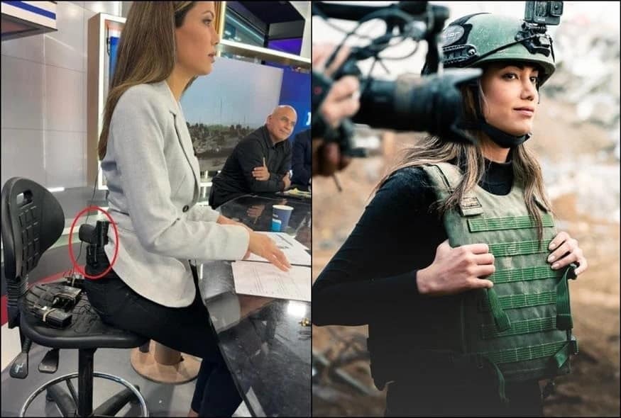 An Israeli news presenter seen here with a gun on her hip during her newscast.