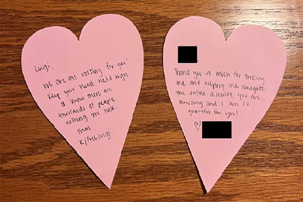 Το σημείωμα βρέθηκε σε ένα ζευγάρι κάλτσες με καρό σχέδιο που δόθηκαν στον Luigi Mangione για την εμφάνιση του στο δικαστήριο του Μανχάταν στις 21 Φεβρουαρίου, όπου αντιμετωπίζει κατηγορίες για φόνο και τρομοκρατία, σύμφωνα με επιστολή από το γραφείο του εισαγγελέα του Μανχάταν.