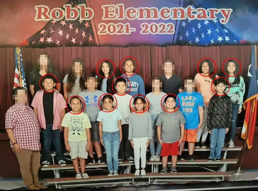 Πρόκειται για τους Eliahana Cruz Torres, 10 ετών, Lexi Rubio, επίσης 10, Annabelle Guadalupe Rodriguez, 10, Maite Yuleana, Xavier Lopez, 10 ετών, Rojelio Torres, 10, Uziyah Garcia, 8, Jayce Carmelo Luevanos, 10, Jacklyn Cazares, 10, Layla Salazar, 10 και Jose Flores, 10. Ο δάσκαλος που βρίσκεται επίσης στη φωτογραφία δεν έχασε τη ζωή του.