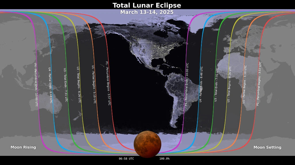 Τη νύχτα της 13ης προς 14η Μαρτίου, οι παρατηρητές του ουρανού στη βόρεια και νότια Αμερική, καθώς και σε περιοχές της Ευρώπης, της Αφρικής και της Ωκεανίας, θα έχουν την ευκαιρία να παρακολουθήσουν μια ολική έκλειψη Σελήνης, γνωστή και ως «Ματωμένο Φεγγάρι», λόγω της κόκκινης απόχρωσης που θα έχει η Σελήνη.