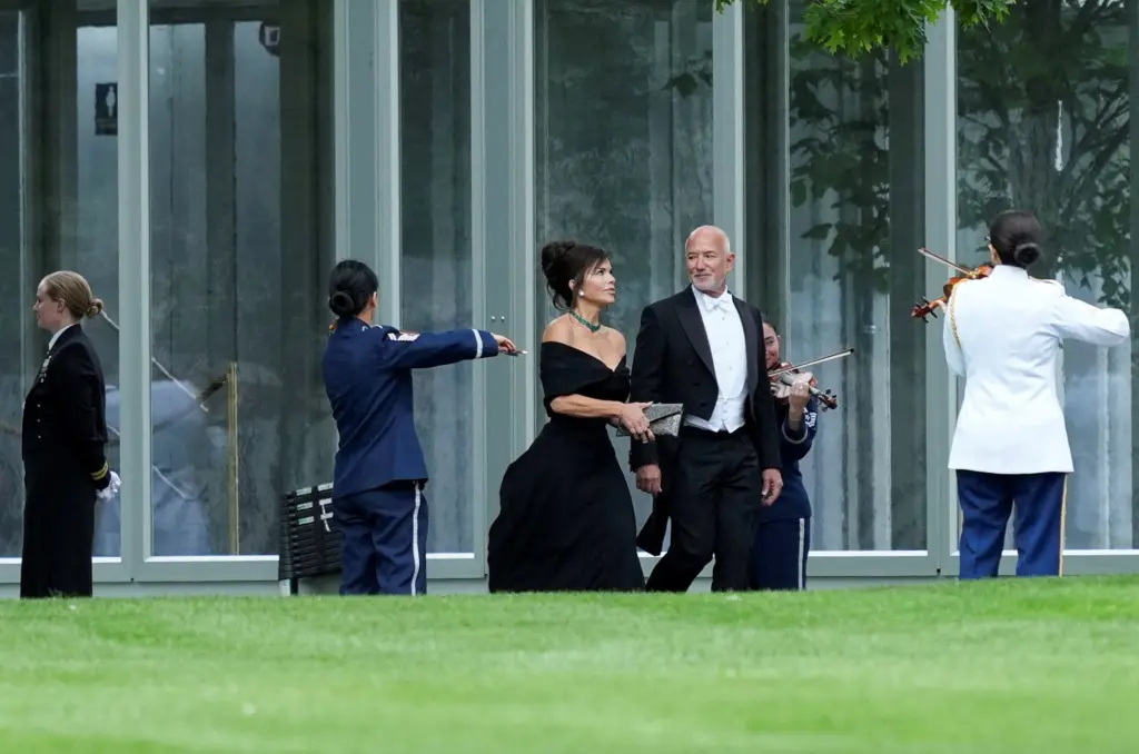 Στο επίσημο δείπνο, οι καλεσμένοι έφτασαν υπέρλαμπροι με τις κυρίες να επιλέγουν -όπως ορίζει το dress code- μακριά φορέματα και τους άνδρες tuxedo, λευκό παπιγιόν.