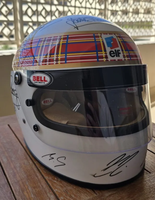 Το λευκό κράνος που υπέγραψε ο Σουμάχερ φορέθηκε από τον 85χρονο Στιούαρτ κατά τη διάρκεια της μακράς καριέρας του και, σύμφωνα με την οργάνωση, έχει επίσης υπογραφεί από όλους τους εν ζωή πρωταθλητές της Formula 1.