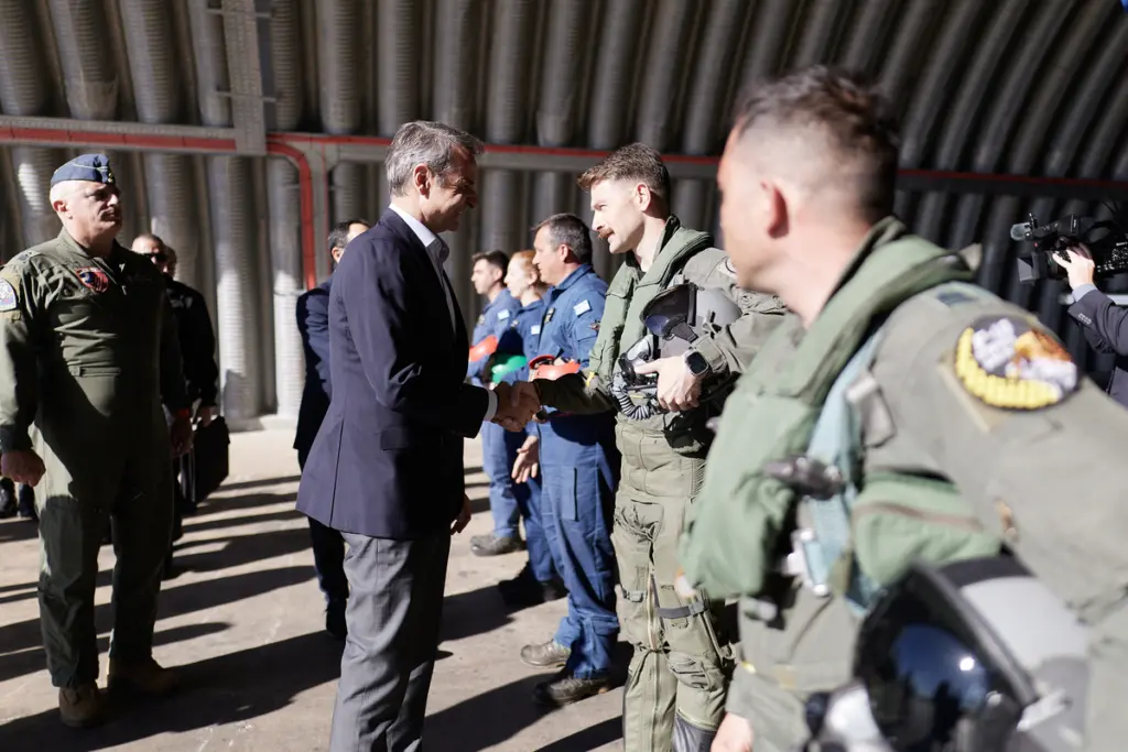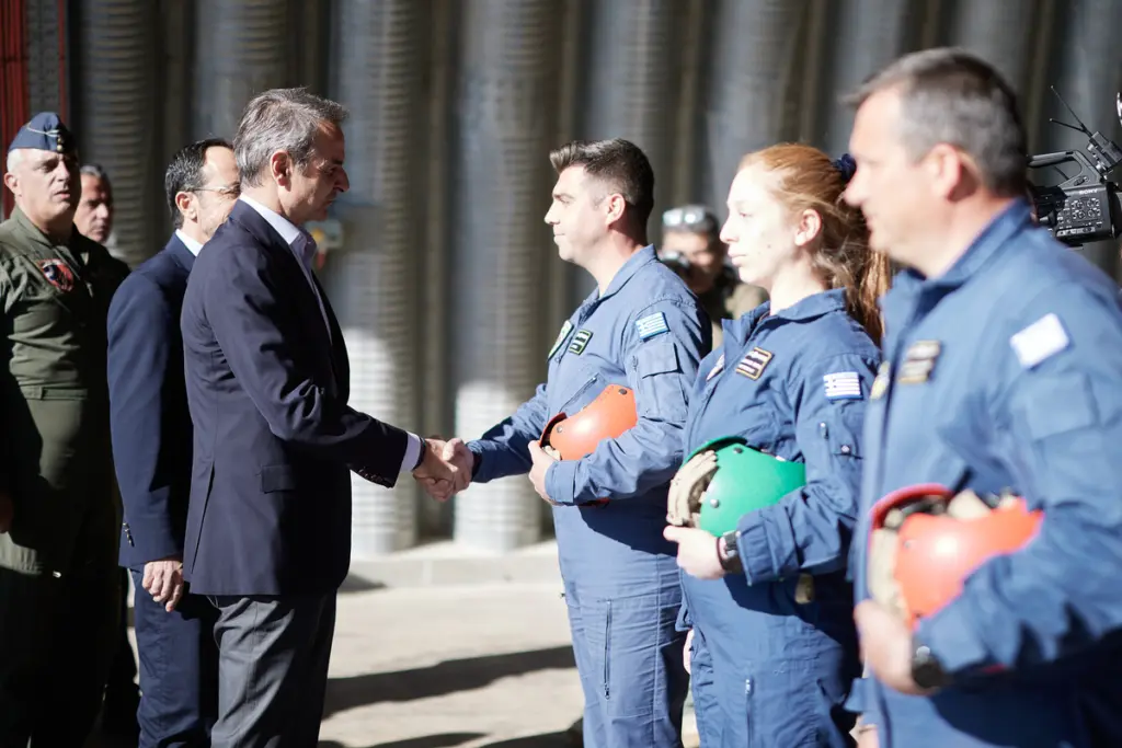 Ο Έλληνας πρωθυπουργός, συνοδευόμενος από τον πρόεδρο της Κυπριακής Δημοκρατίας Νίκο Χριστοδουλίδη και το υπουργό Εξωτερικών, Γιώργο Γεραπετρίτη, συναντήθηκε με τους πιλότους και το προσωπικό της Πολεμικής Αεροπορίας και τους χαιρέτησε στον χώρο όπου επιχειρούν τα ελληνικά μαχητικά F-16.