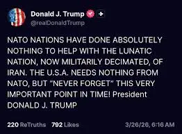 Trump: “NATO NATIONS HAVE DONE ABSOLUTELY NOTHING TO HELP WITH THE LUNATIC NATION, NOW MILITARILY DECIMATED, OF IRAN. THE U.S.A. NEEDS NOTHING FROM NATO, BUT ‘NEVER FORGET’ THIS VERY IMPORTANT POINT IN TIME! President DONALD J. TRUMP” pic.twitter.com/E7eqLHUXMg