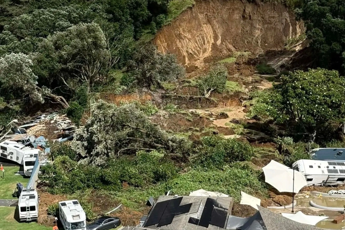Eyewitness helicopter footage showed multiple landslides across northern New Zealand after intense rainfall, including a major slide at a campsite in Mount Maunganui, a popular coastal tourist spot. Rubble from hillsides damaged structures and camper vans, while rescue teams… pic.twitter.com/HuZrufS3uO