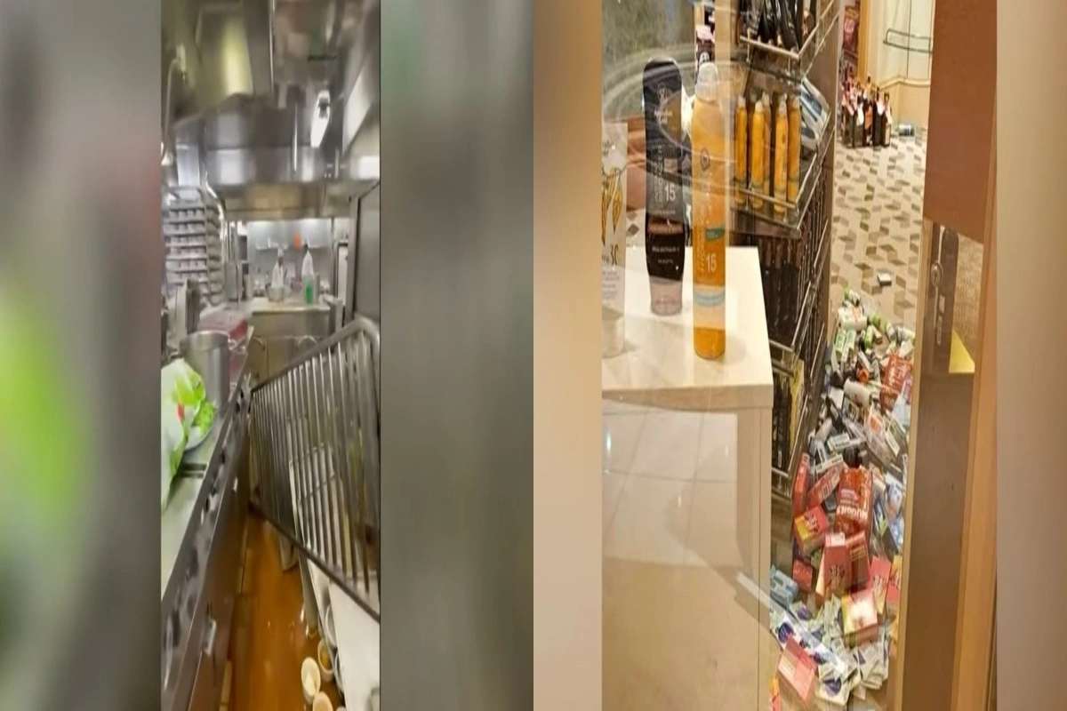 Στην κουζίνα του κρουαζιερόπλοιου οι εργαζόμενοι προσπαθούν να διατηρήσουν την ισορροπία τους, ενώ γύρω τους έπεφταν πιάτα και άλλα αντικείμενα.