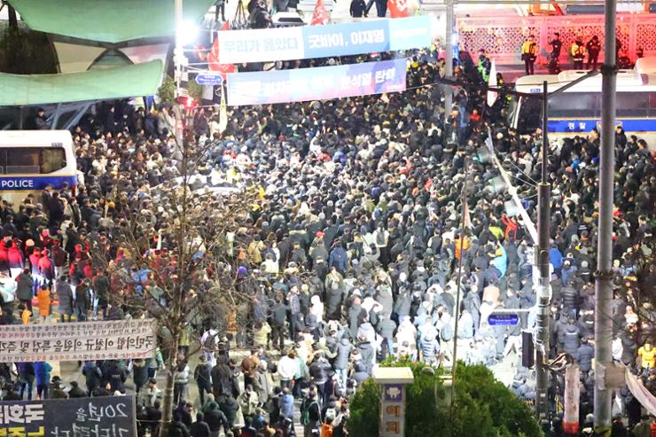 Μπροστά από το κτήριο του Κοινοβουλίου, όπου 190 βουλευτές ψήφισαν χθες, Τρίτη, ομόφωνα πρόταση για άρση του στρατιωτικού νόμου που είχε ανακοινώσει δυόμισι ώρες νωρίτερα ο πρόεδρος σε τηλεοπτικό διάγγελμα, το οργισμένο πλήθος παραμένει ενωμένο απέναντι στον συντηρητικό πρώην γενικό εισαγγελέα.