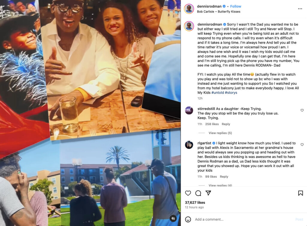 Ο πρώην παίκτης του NBA, Ντένις Ρόντμαν, φαίνεται ότι ενημερώθηκε για τα σχόλια της Τρίνιτι. Την Τετάρτη, αφιέρωσε ένα Instagram reel στη κόρη του, στο οποίο τον δείχνει να περιηγείται σε ένα άλμπουμ φωτογραφιών που περιλαμβάνει και εικόνες του γιου του, DJ.